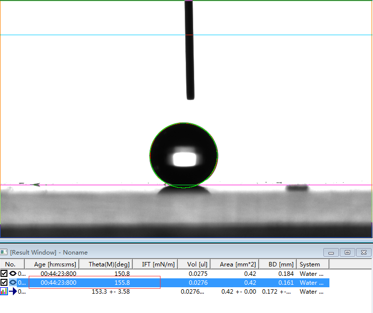 2、專業(yè)的接觸角測量儀,或者真正的接觸角測量儀必須是建議在Young-Laplace方程擬合的基礎(chǔ)上的。判斷是否采用了Young-Laplace方程擬合算法的方法非常簡單,將如上第1、6和第7行的第一張圖片下載下來后,分析其接觸角值。如果能夠?qū)崿F(xiàn)邊緣擬合度好,且出現(xiàn)接近我們公示的角度值且能夠出現(xiàn)相應(yīng)的表面張力值時,則說明該軟件采用了Young-Laplace方程擬合算法,否則極可能是采用橢圓擬合的假Young-Laplace方程擬合算法。